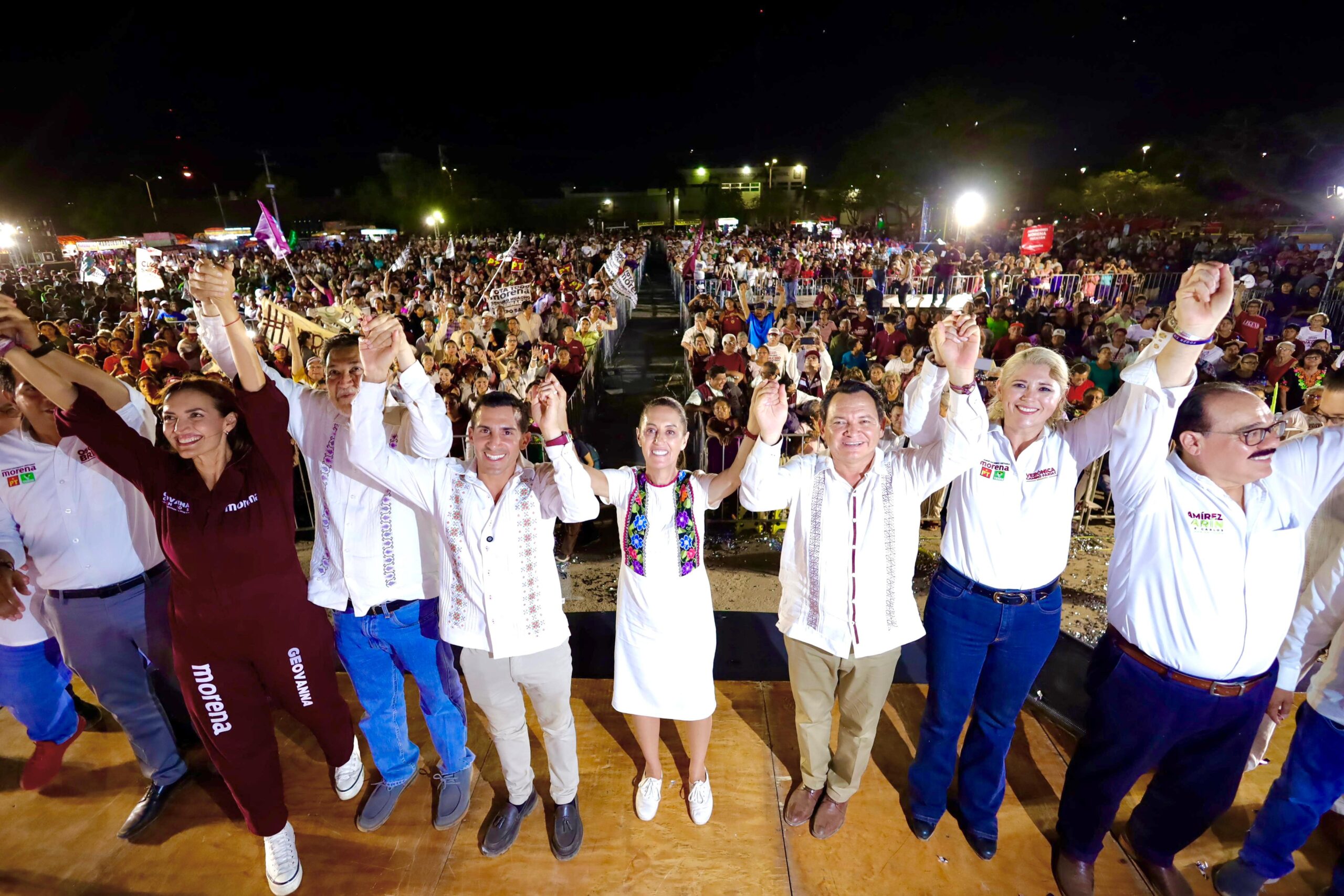 Sheinbaum destacó la propuesta de Huacho del Plan Renacimiento Maya para generar infraestructura a favor del desarrollo y recordó que ella a nivel federal garantizará becas universales para estudiantes de escuelas públicas, pensión para mujeres de 60 a 64 años, apoyo a la vivienda e incremento al salario mínimo.