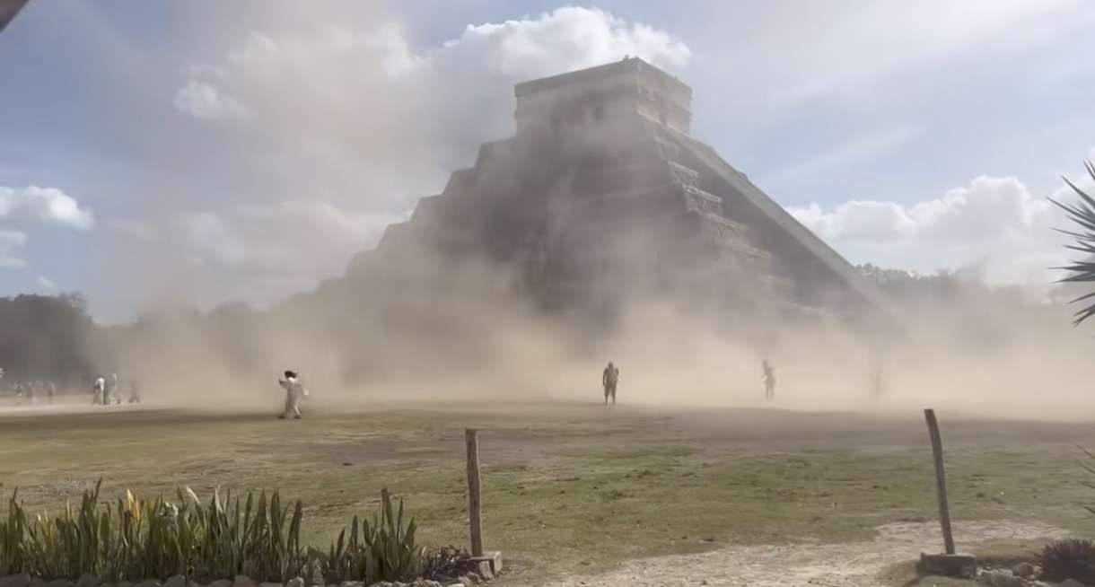En una grabación de poco más de unos 20 segundos se observa el avance del torbellino en la explanada del Templo de Kukulcán, junto con la polvareda que arrastró la columna de aire llegando al área en la que se encontraba visitantes nacionales y extranjeros.