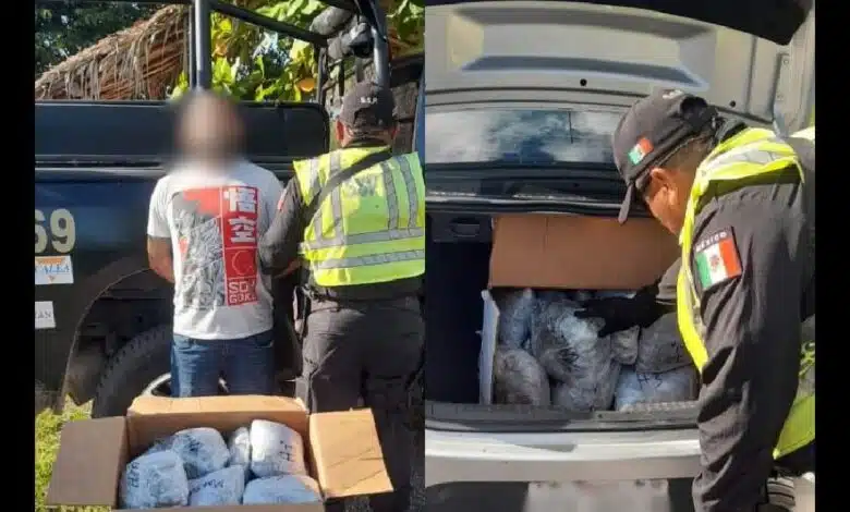 De acuerdo con la información oficial, el conductor identificado como Jorge Alejandro G. V., de 41 años y originario de Quintana Roo, transportaba en la cajuela una caja de cartón que contenía los paquetes de droga, cada uno emplayado de manera individual.