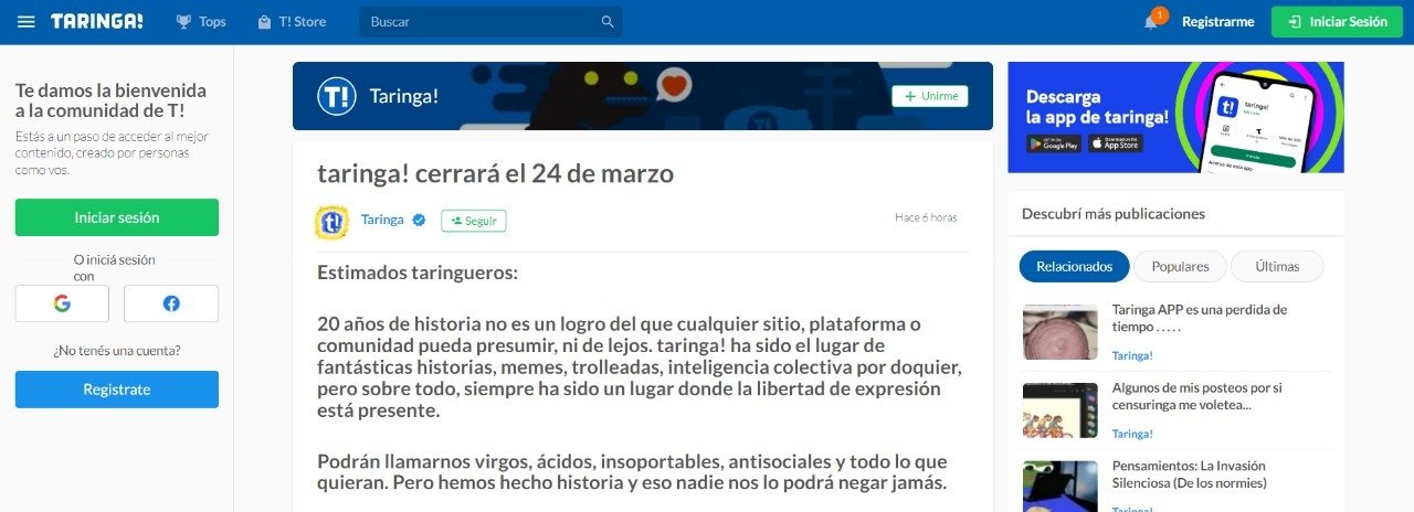 Taringa, la icónica plataforma argentina y pionera de las redes sociales en Latinoamérica, anuncia su cierre definitivo para el 24 de marzo, marcando el fin de una era digital