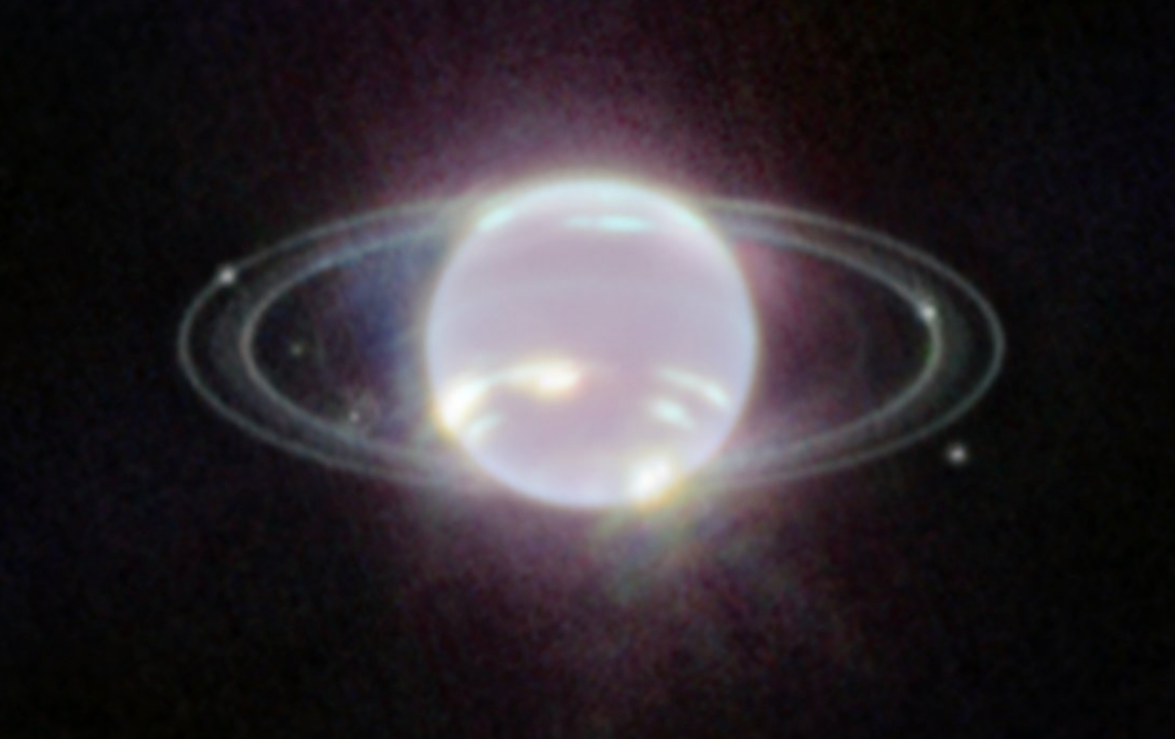 En las imágenes de Webb, gracias a su cámara de infrarrojo cercano Neptuno no aparece azul. Además se observa una fina línea de brillo que rodea el ecuador del planeta, que podría ser una firma visual de la circulación atmosférica global que impulsa los vientos y las tormentas del planeta.