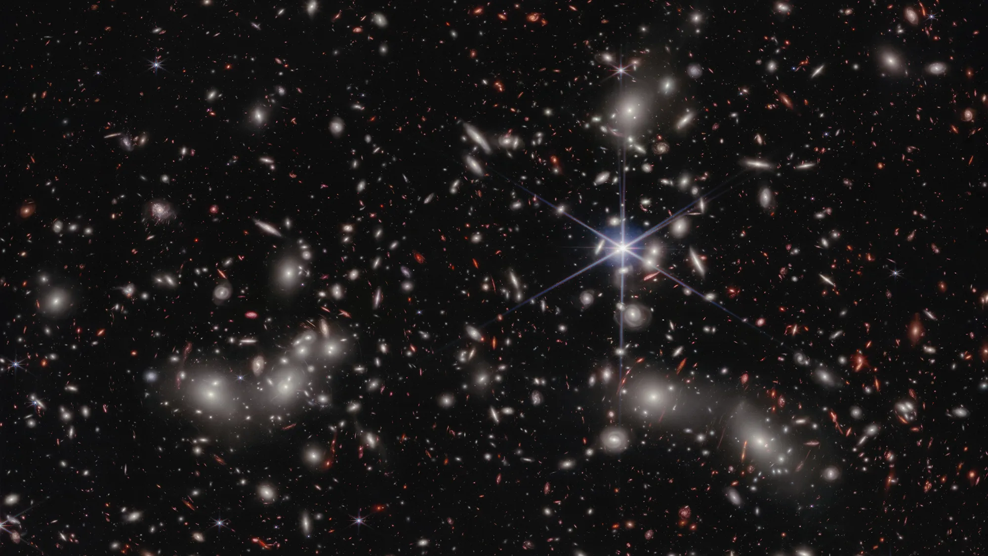 El telescopio espacial James Webb desveló detalles nunca antes vistos de una región del espacio conocida como Cúmulo de Pandora; la imagen muestra tres cúmulos de galaxias, ya de por sí masivos, que se unen para formar un megacúmulo.