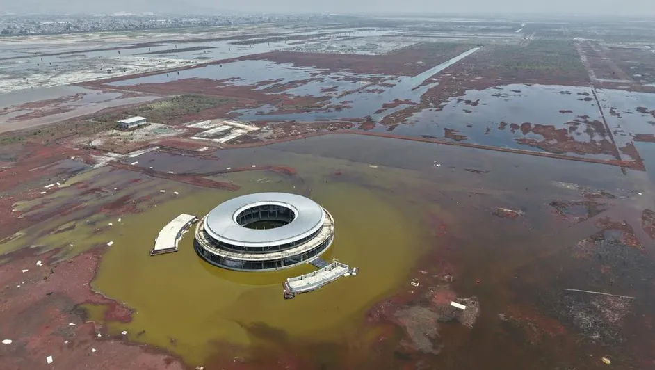 El edificio terminal en forma de X, que formaría parte del Nuevo Aeropuerto Internacional de México (NAIM) en el Lago de Texcoco, luce inundado tras las recientes lluvias.