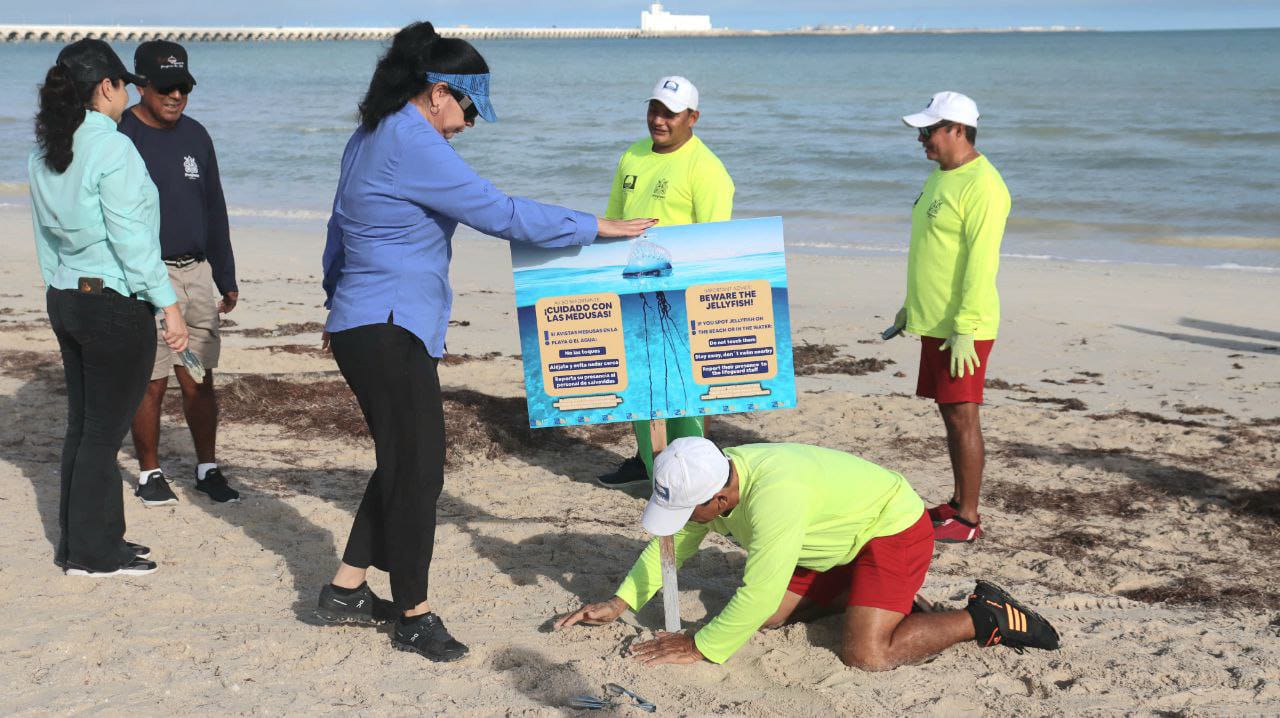 Con la instalación de letreros informativos a lo largo de los malecones Tradicional e Internacional, la Dirección de Turismo refuerza la brigada de recolección e información sobre la presencia de medusas carabelas portuguesas en el puerto.