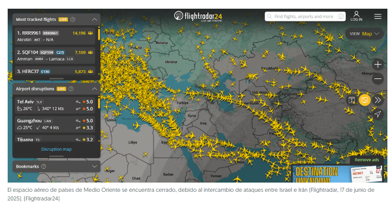 El conflicto entre Irán e Israel ha cerrado el espacio aéreo en todo el Medio Oriente al tiempo que los dos enemigos acérrimos lanzan ataques y represalias entre sí. El pasado 13 de junio, Israel lanzó misiles sobre Irán bajo el argumento de que era un “ataque preventivo”.