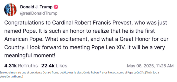 “Felicitaciones al cardenal Robert Francis Prevost, quien acaba de ser nombrado Papa. Es un gran honor saber que es el primer Papa estadounidense. ¡Qué emoción y qué gran honor para nuestro país! Espero con entusiasmo conocer al Papa León XIV. ¡Será un momento muy significativo!“, publicó en su red Truth Social.