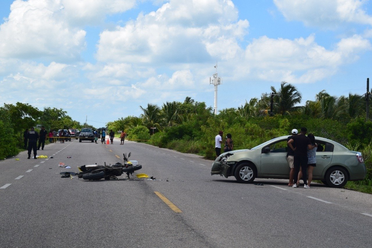 El percance ocurrió en el tramo de la carretera que conecta a Chuburna con Chelem, específicamente en la calle 9 por 108, cuando circulaba Olga Ileana Pinzón Gutiérrez de 39 años a bordo de un motocicleta AX100 Suzuki pero fue colisionada por un carro de la marca Nissan que se disponía a tomar la carretera desde la salida de una cochera de la zona costera pero sin hacer un alto preventivo.