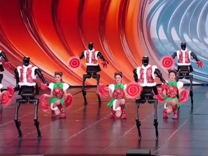 Uno de los momentos más llamativos ocurrió cuando 16 robots humanoides, vestidos con chaquetas rojas festivas, subieron al escenario para bailar junto a varias artistas femeninas humanas.