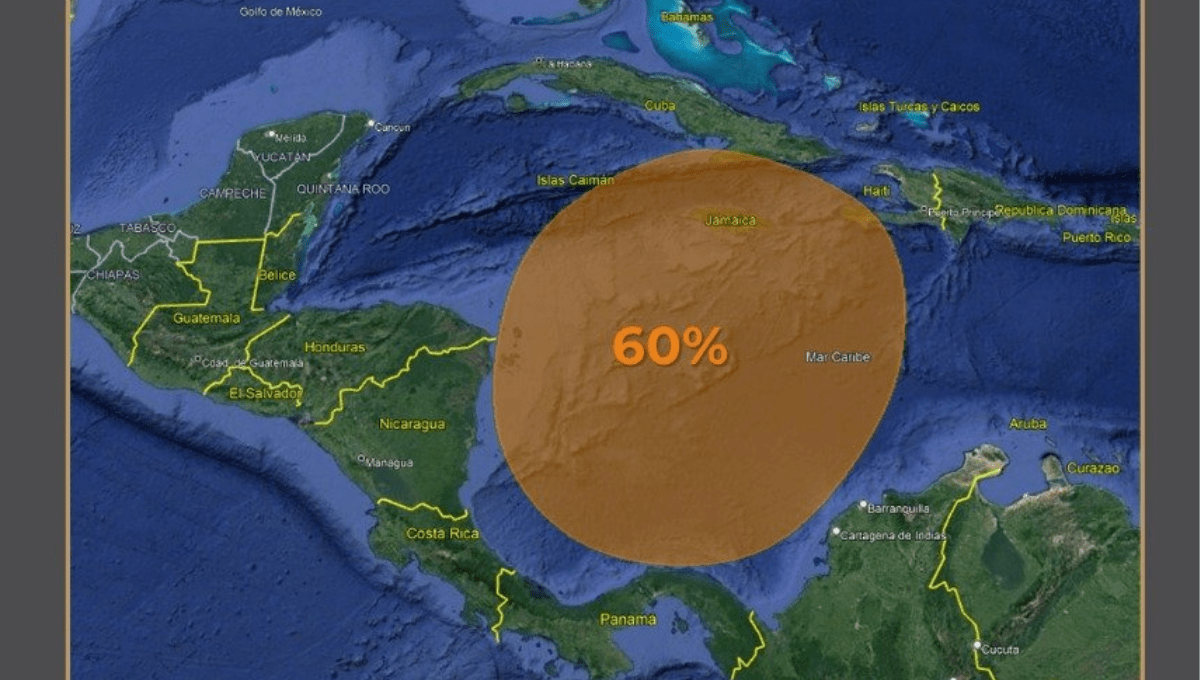 Esta zona se encuentra al Suroeste del Mar Caribe con 60% de probabilidad de convertirse en un ciclón en los próximos 7 días, siendo la última actualización a las 18:00 horas de este 12 de noviembre.