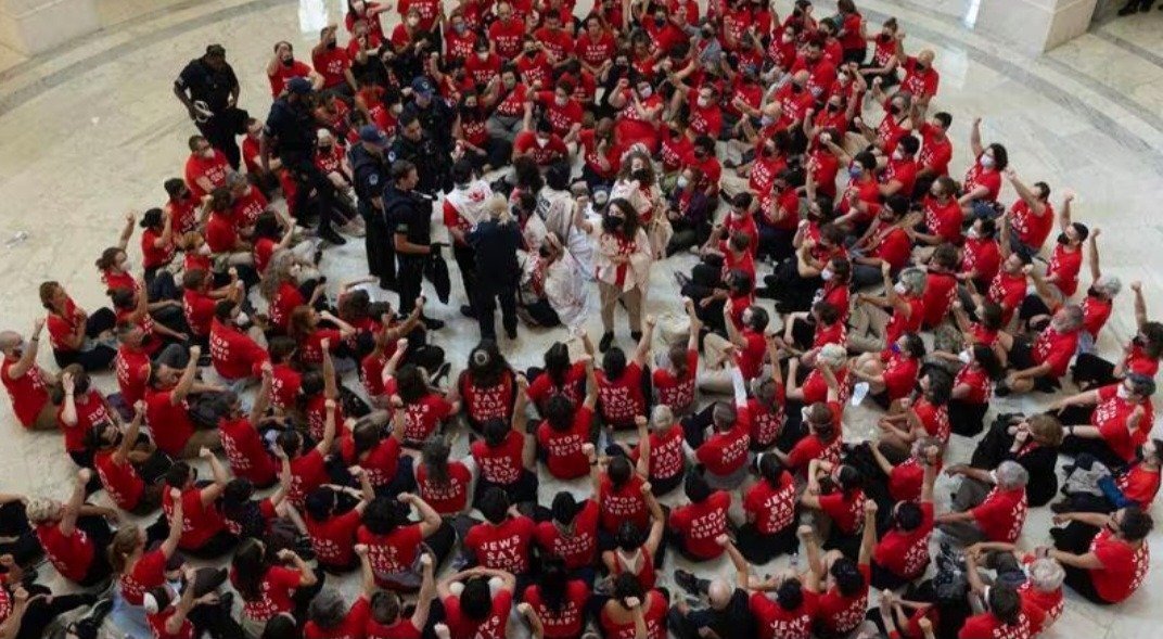Los manifestantes también llevaban pancartas con los lemas “los judíos dicen al Congreso: detengan el envío de armas a Israel” o “nadie es libre hasta que todos sean libres”.